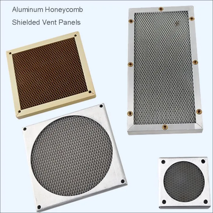 Aluminiowe ekranowane panele wentylacyjne o strukturze plastra miodu są wykonane z aluminium lub stali o strukturze plastra miodu zamontowanej w ramie. Dostępnych jest wiele stylów aluminiowych ramek o różnych grubościach i konfiguracji plastra miodu, aby spełnić różne wymagania dotyczące ekranowania. Dostępne są kratki ochronne dla obszarów wrażliwych wraz z piankami do filtracji kurzu. Można określić utlenianie chromianu, niklowanie chemiczne, cynowanie i pasywację.